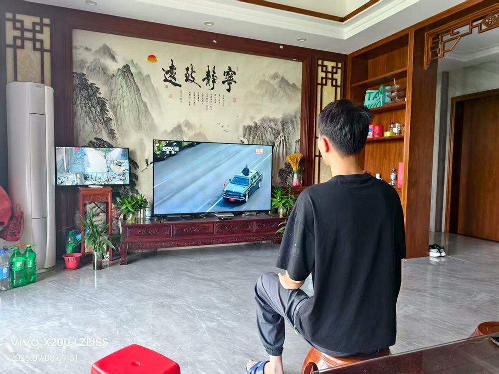 今天,我全程收看了纪念中国人民抗日战争暨世界反法西斯战争胜利80周年大会直播,第一时间学习了习近平总书记发表的重要讲话。天安门广场上,人民军队接受习近平总书记和全国人民的检阅,新一代武器装备集中亮相,让我心潮澎湃、倍感自豪。