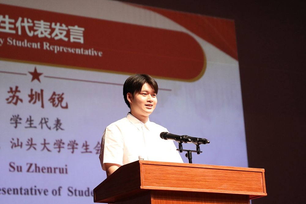2022级土木工程专业本科生苏圳锐从学生视角出发,点赞“老师们既用学术的高度,更用育人的温度,把‘大先生’三个字写得力透纸背,也把‘汕大人’的底色擦得熠熠生辉”。他强调,作为新一代“汕大人”,将谨记师长们的谆谆教诲,把“团结、勤奋、求实、创新”的校训熔铸成青春最鲜亮的底色,以昂扬向上的精神风貌和强国有我的责任担当,奋力书写挺膺担当的青春篇章。