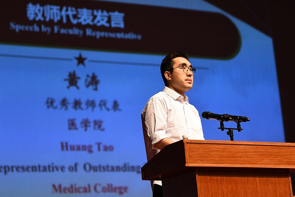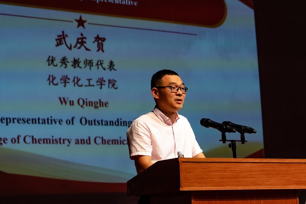 化学化工学院武庆贺教授作为优秀教师代表发言。他回顾了在汕大的8年时光,并用“三个选择”向大家分享了自己在工作、科研之路上的思索与经验——选择“始终扎根一线的勤奋与投入”;选择“做难事”;选择“持之以恒”。武庆贺借用任正非的话“让听到炮声的人呼唤炮火”,分享了从中得出的职业经验“只有亲耳听着实验室前线的‘枪声’和‘炮声’,才能做出最准确的判断,和学生们的并肩战斗,也让我赢得了他们的信任”。