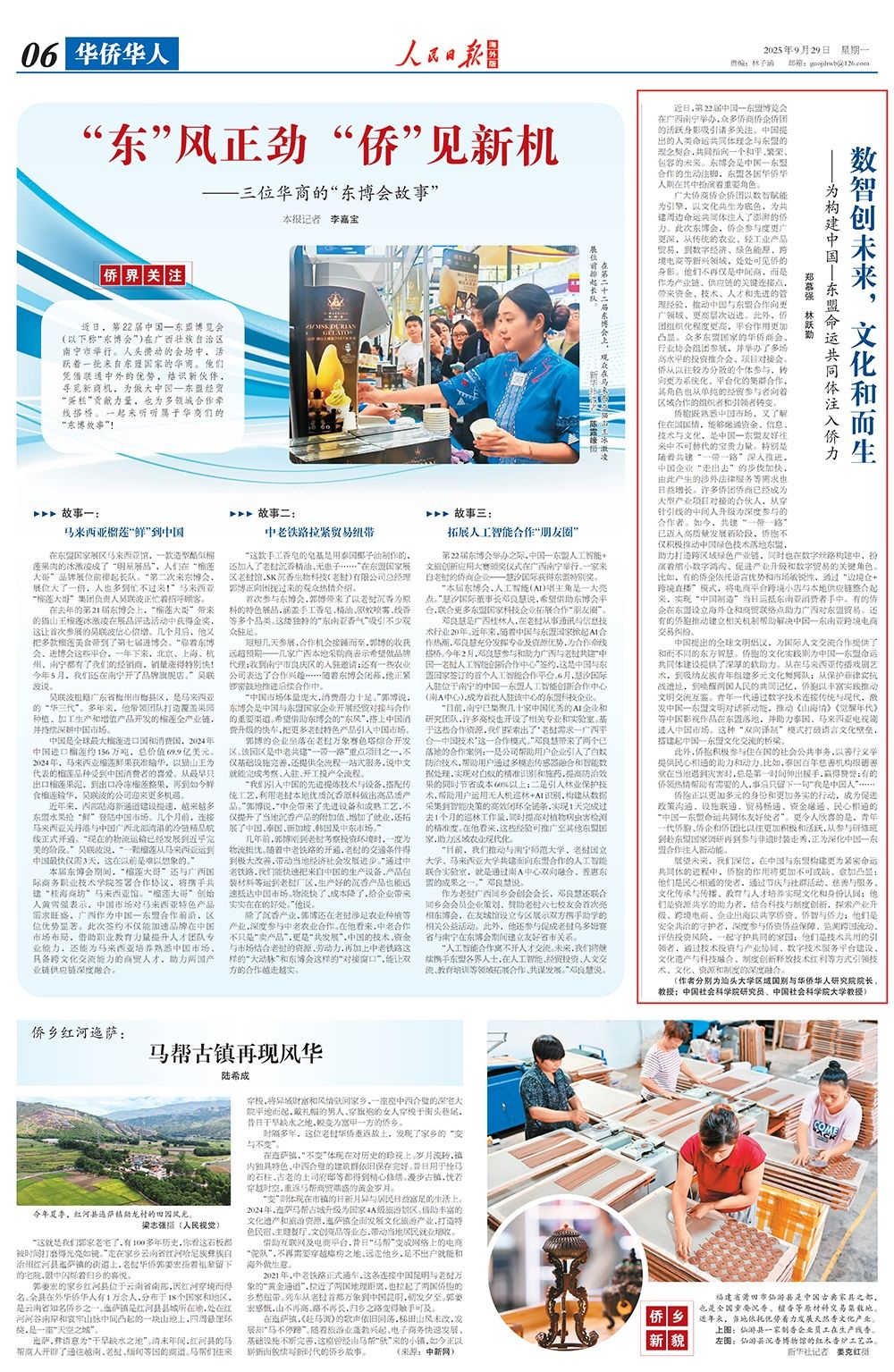 9月29日,《人民日报》(海外版)第06版:华侨华人刊发由郑慕强教授在《人民日报》(海外版)刊文撰写的理论文章《数智创未来,文化和而生——为构建中国—东盟命运共同体注入侨力》。现将全文转载如下: