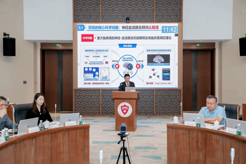 随后,会议进入项目组汇报及专家质询环节。项目负责人郝志峰系统介绍了项目立项背景、总体目标、技术路线及组织管理等核心内容,并就项目总体的执行方案作了详细的汇报。各课题负责人围绕研究内容、技术攻坚与转化目标以及具体实施计划展开汇报。项目专家组对项目意义、目标及团队基础给予肯定,同时围绕技术可行性与科学问题进行质询讨论并提出指导性建议,强调关注非侵入式写入技术难度,明确神经-血流耦合的时间尺度关联,细化数字孪生脑功能定义,补充疾病研究结论支撑,并规范技术标准化路径。