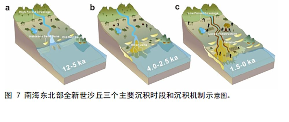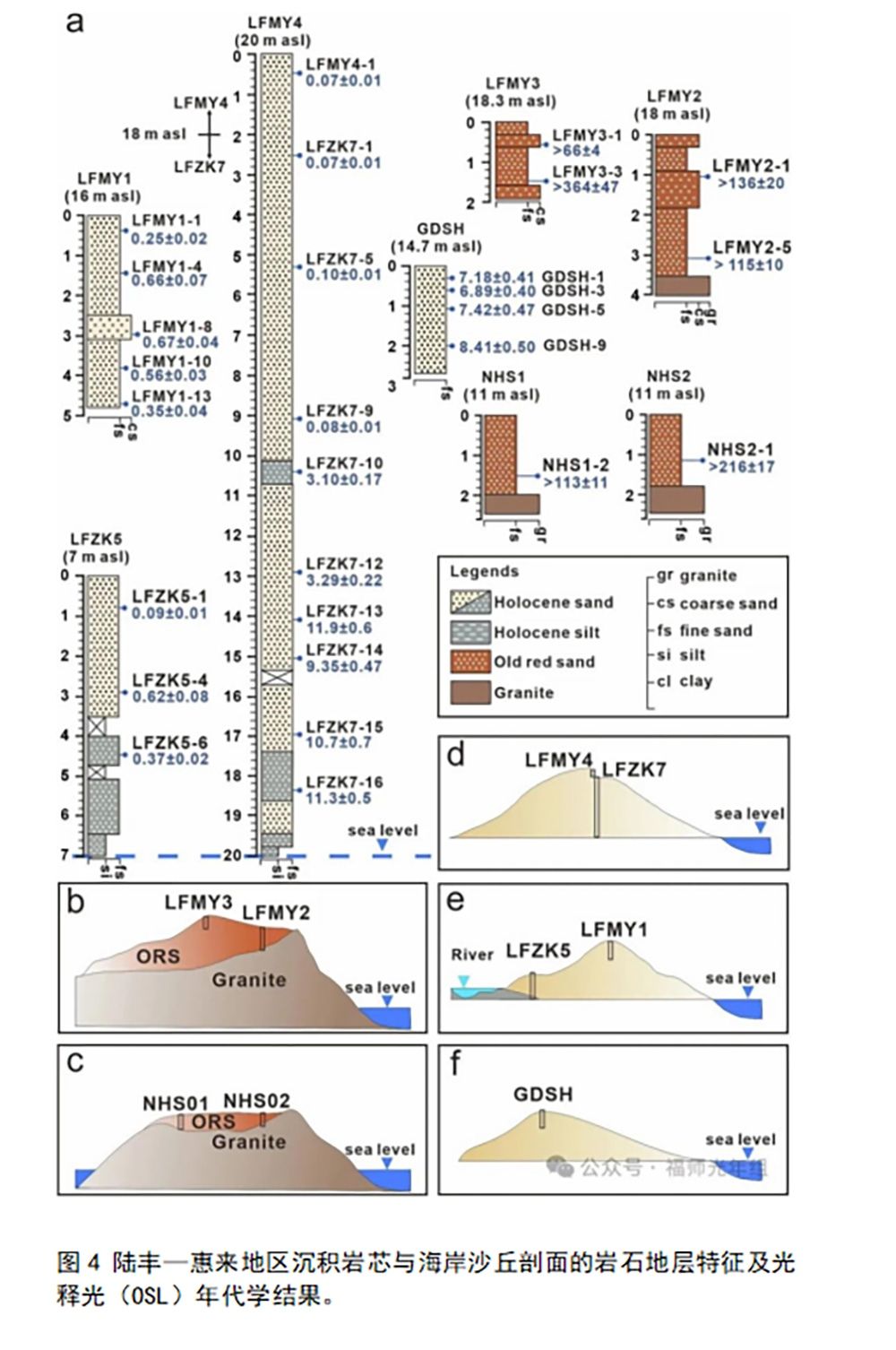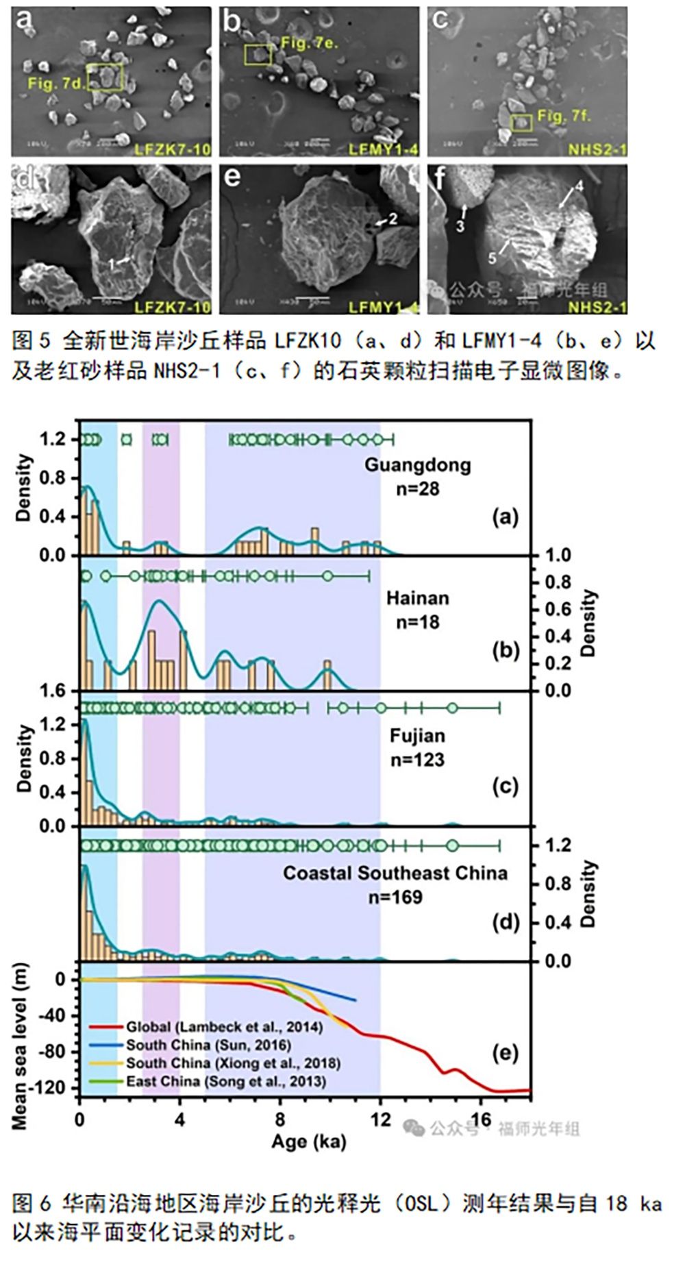 广东省有长约4300公里的海岸线,其海岸沙丘沉积记录对于重建全新世以来的海岸环境变化与人类活动影响具有重要意义。然而,目前对于这些海岸沙丘沉积序列的精确定年及成因机制,特别是其区域差异性和形成驱动力,仍缺乏系统、深入的认识。本研究在广东东部陆丰—惠来地区的沙丘进行了钻探、野外采样及光释光(OSL)测年、矿物颗粒形态分析的工作。研究结果表明:(1)广东海岸老红砂的OSL测年结果显示其形成于海洋氧同位素5阶段(MIS 5)。(2)对南海东北部沿海地区已发表的169个全新世沙丘年代数据(包括已发表的147个和本研究的22个OSL年代)的综合分析揭示了该地区沙丘沉积的三个主要阶段:分别为12–5 ka、4–2.5 ka和1.5–0 ka。(3)气候和人类活动影响了全新世海岸沙丘的形成过程。该成果为深入理解华南沿海地貌演化及其驱动机制提供了重要年代学证据。