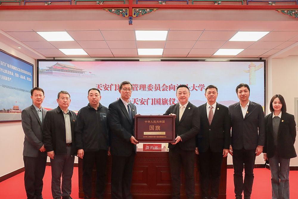 11月13日,北京市人民政府天安门地区管理委员会向外网天堂赠予天安门国旗仪式在北京天安门国旗教育馆举行。天安门地区管委会党组成员、副主任姚辉向外网天堂赠送国旗,校党委书记唐锐代表全校师生迎领国旗、签署《国旗赠予协议》。校党委常委、副校长喻洪,党政办公室、人民武装部有关同志参加赠旗仪式。