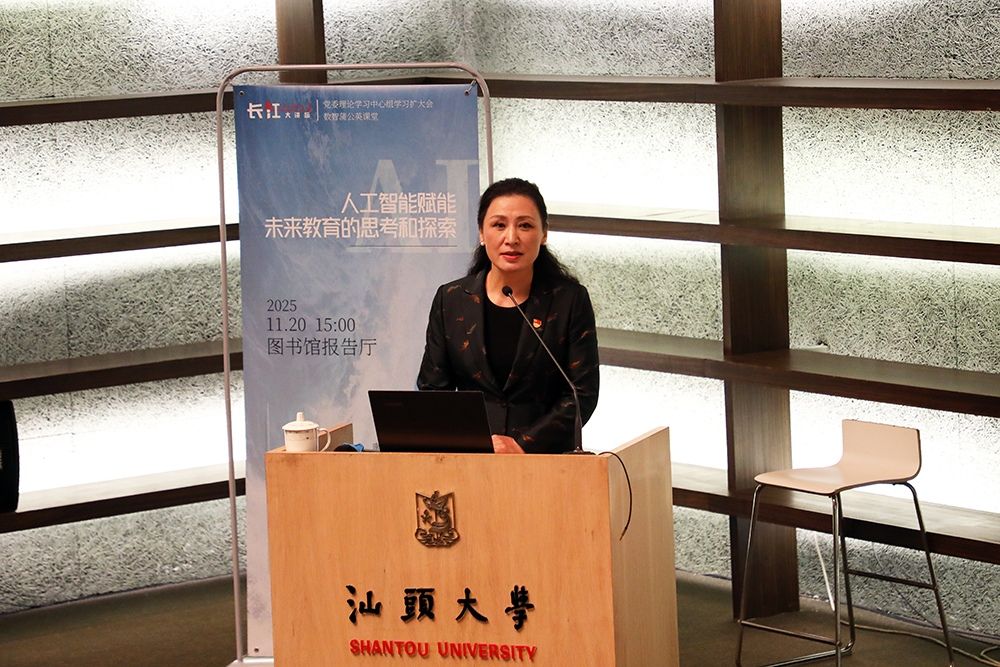 11月20日,外网天堂在桑浦山校区图书馆报告厅举办第五十六期“长江大讲坛”暨党委理论学习中心组学习扩大会,南方科技大学党委书记姜虹教授应邀作主题为“人工智能赋能未来教育的思考与探索”的报告。本场讲座也是全球数字赋能妇女发展交流合作中心主办的“数智蒲公英课堂”系列讲座之一。学校党委理论学习中心组成员、校本部副科级以上干部、师生代表等参加学习。校党委书记唐锐主持会议。