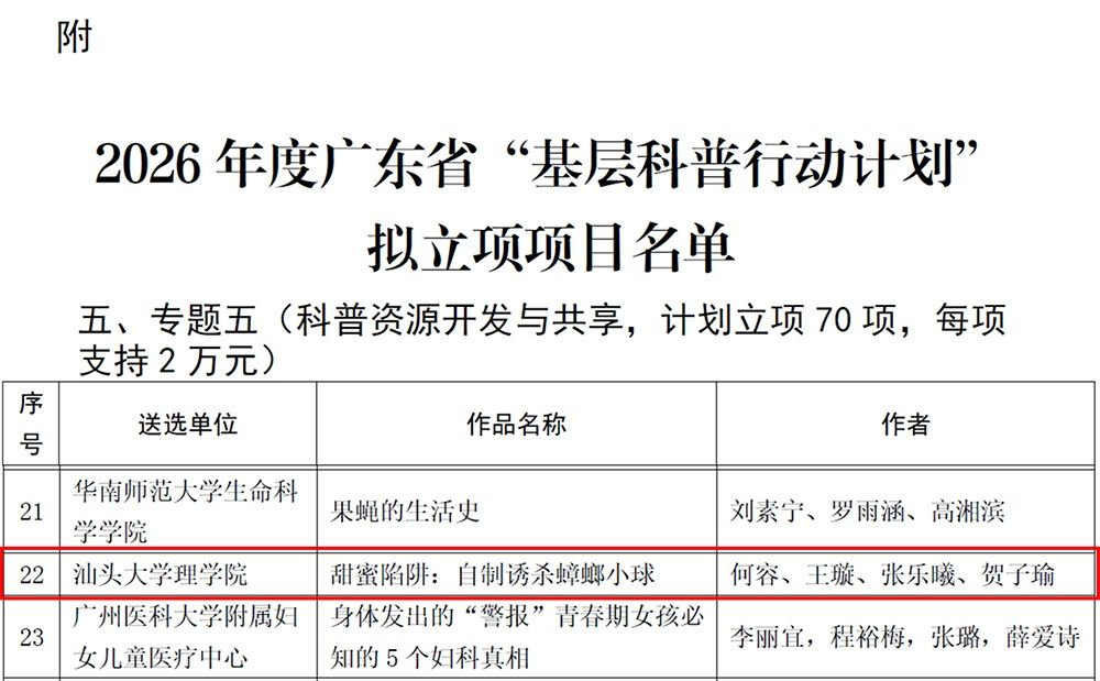 近日,由广东省科学技术协会组织的2026年度广东省“基层科普行动计划”项目确定了拟立项项目,理学院生物技术专业学子何容、王璇、张乐曦、贺子瑜的短视频科普作品《甜蜜陷阱:自制诱杀蟑螂小球》(指导老师:蔡润林博士)获得立项资助,资助金额为2万元。