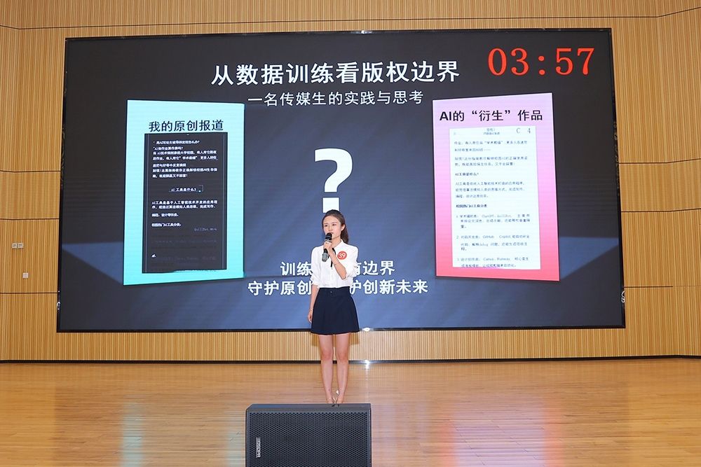 比赛中,文希同学以广东非遗美食为切入点,阐释版权对传统文化创新的保护作用;林嘉莹同学以数字文物“皇后之玺”为例,探讨文化遗产数字化中的版权保护机制;姚欣雨同学结合亲身经历,分析人工智能训练与版权边界问题。三位同学的演讲紧扣时代脉搏,主题鲜明、见解独到,展现了汕大学子的思辨风采与时代关怀。