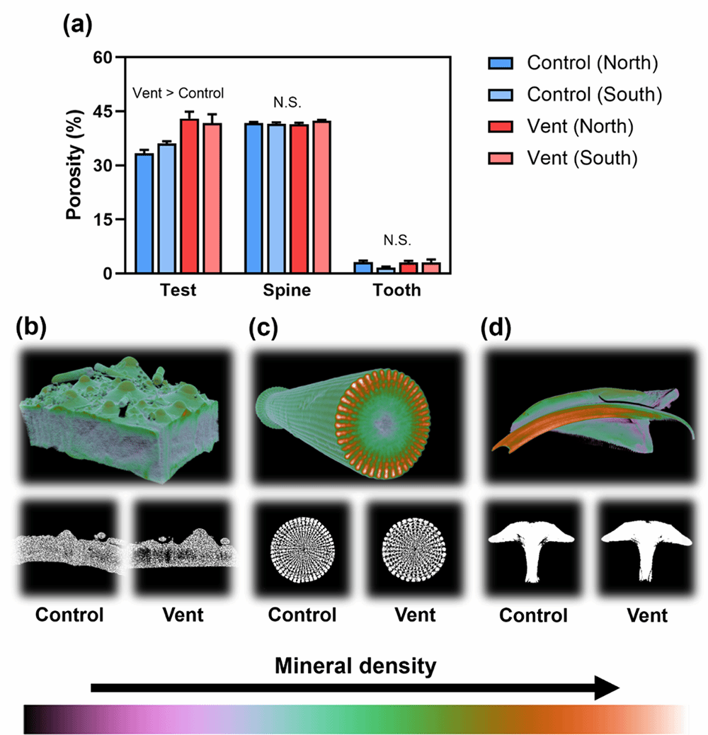 为此,外网天堂海洋生态与环境平台梁裕升教授聚焦探索海洋酸化对海胆钙化结构及功能的影响,对生活在天然二氧化碳喷口区的一种海胆的外壳、牙齿和棘刺的形态特征、机械性能和化学成分进行了系统分析,以评估海胆在酸化环境中能否产生形态适应性变化。研究发现,尽管海胆各类钙化结构在酸化环境中尺寸有所缩小,但其机械性能仍得以维持。这表明海胆或可通过形态调整,在维持防御功能的同时,将更多能量分配至生长和繁殖,从而提升其在酸化海洋中的整体适应能力。