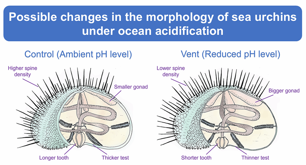 海胆不仅以其独特风味和高营养价值风靡全球餐桌,也是海洋生态系统中不可或缺的成员。它们进化出的坚硬钙质外壳与棘刺构成了天然的防护体系,对其生存与繁衍至关重要。然而,海洋因人类近世纪加速排放二氧化碳而加剧酸化,这可能会抑制海胆钙质外壳的形成,进而导致其体型变小。但也有研究发现,一些钙化生物即使体型缩小,仍能维持生存。这暗示体型缩小或许并非代表海胆的退化,而可能代表其适应海洋酸化的一种生存策略。海胆能否实现这种适应,及其潜在机制仍有待进一步探索。