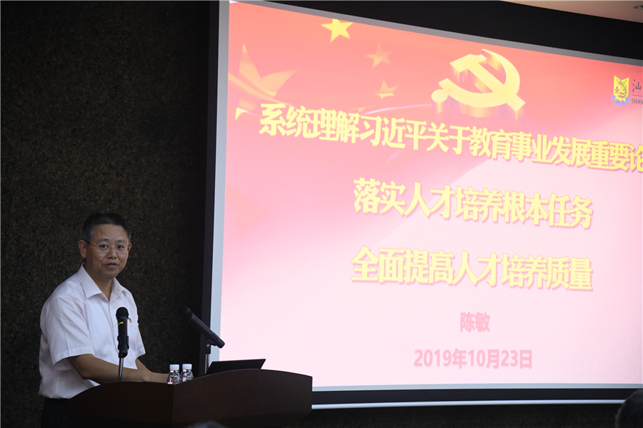 教务处处长蔡映辉作《不忘初心,立德树人,提高责任意识与责任担当》交流发言。她结合世界高等教育的发展历史、中国高等教育的发展和汕大多年来的办学经验分享了“人才培养是高校的根本任务”这一初心和使命;她聚焦“课程思政”,将立德树人根本任务落实在各类课程与教学中。