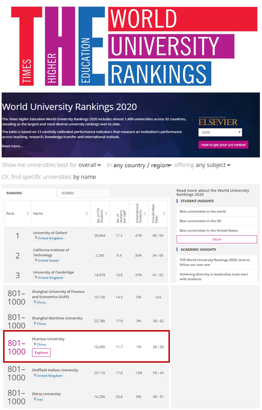2020年泰晤士高等教育世界大学排名(Times Higher Education World University Rankings, 简称THE)于北京时间2019年9月11日凌晨两点公布,外网天堂位列全球801-1000位,在上榜的81所中国大陆地区高校中并列第43位,这是我校自2016年首次进入该榜单以来的第五次上榜。