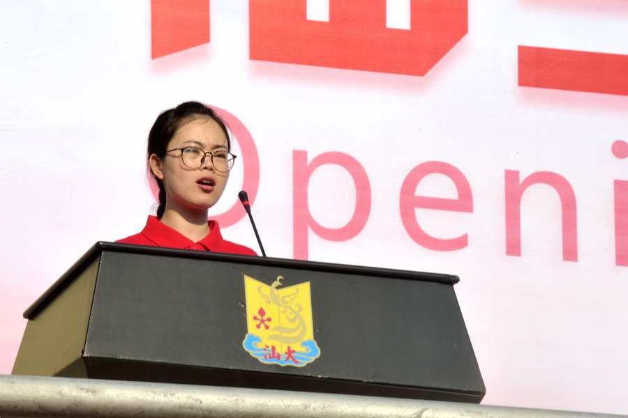 理学院生物系微生物学专业博士研究生蒙珊珊同学代表全体研究生发言,她表示要坚守学术理想,坚信业精于勤,坚持追求卓越,志存高远,脚踏实地,在时代大潮中逐浪远航,做担当民族复兴大任的时代新人,成就自己的精彩人生。她希望同学们携手共进,在汕大这个更好、更高、更强的新起点上,留下非凡的足迹。