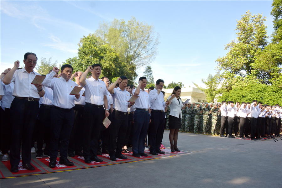 升旗仪式上,在2018级国际经济与贸易专业、明德书院的龚杏玲同学的领誓下,全体师生在进行郑重宣誓。