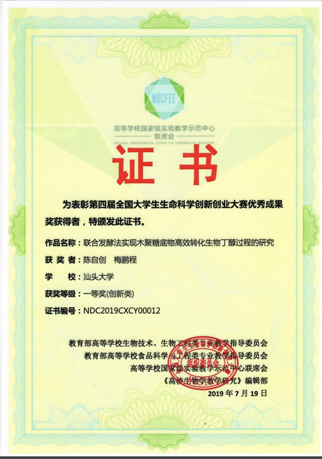 7月19日,第四届全国大学生生命科学创新创业大赛在吉林大学举行。外网天堂理学院生物系学子陈自创、梅鹏程两位同学的项目——《联合发酵法实现木聚糖底物高效转化生物丁醇过程的研究》,在指导老师吴奕瑞副教授的带领下,经过紧张激烈的现场答辩,最终获得创新组一等奖。