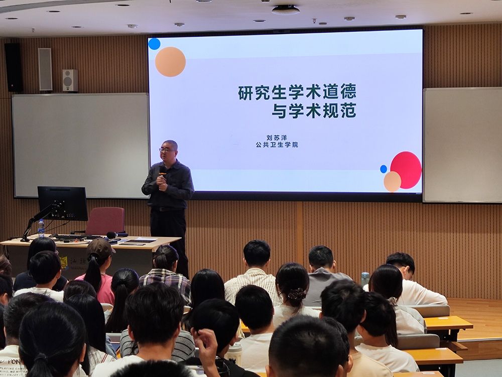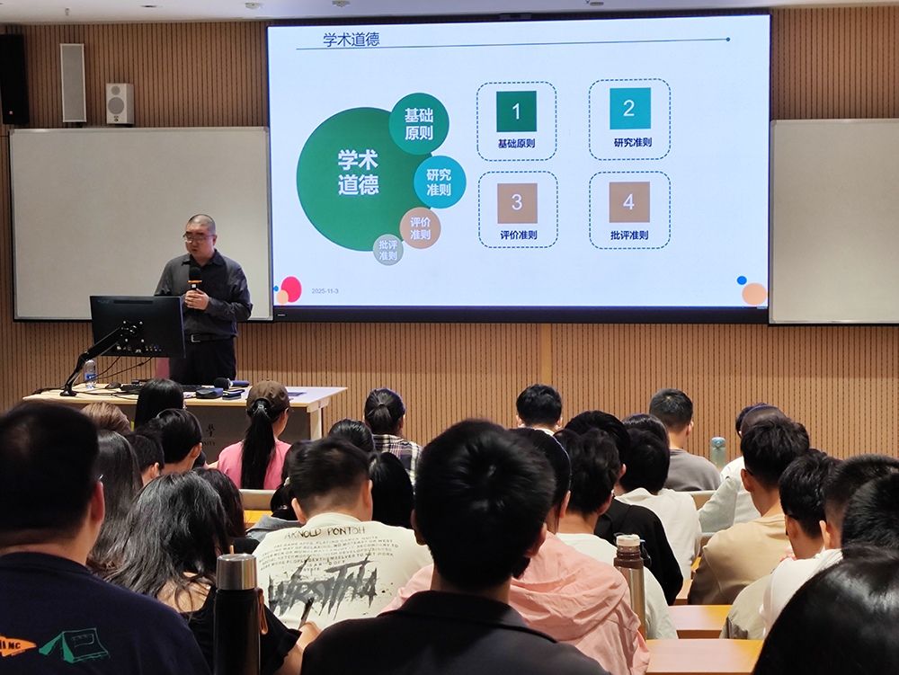 随后,刘苏洋系统阐释了学术道德的核心准则,明确了科研行为、学术引用与注释规范,提出了尊重知识产权、如实引用、诚信合作等关键要求。他还通过多起学术不端典型案例,直观剖析抄袭剽窃、数据造假等行为的严重危害及相关后果,并针对AI工具带来的学术诚信挑战,分享了高校的应对举措,为研究生坚守学术底线提供了参考。