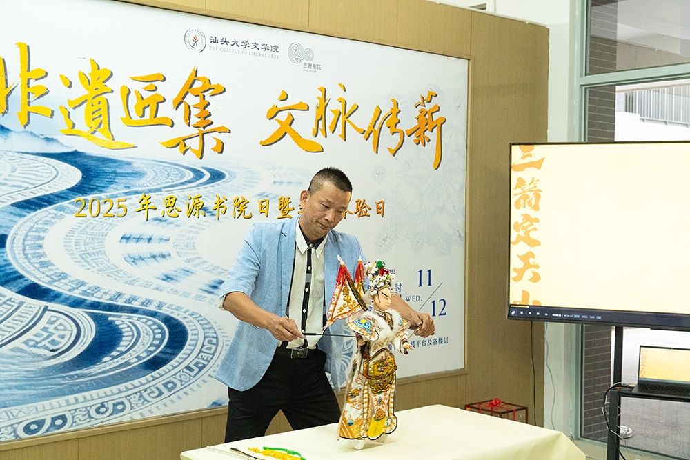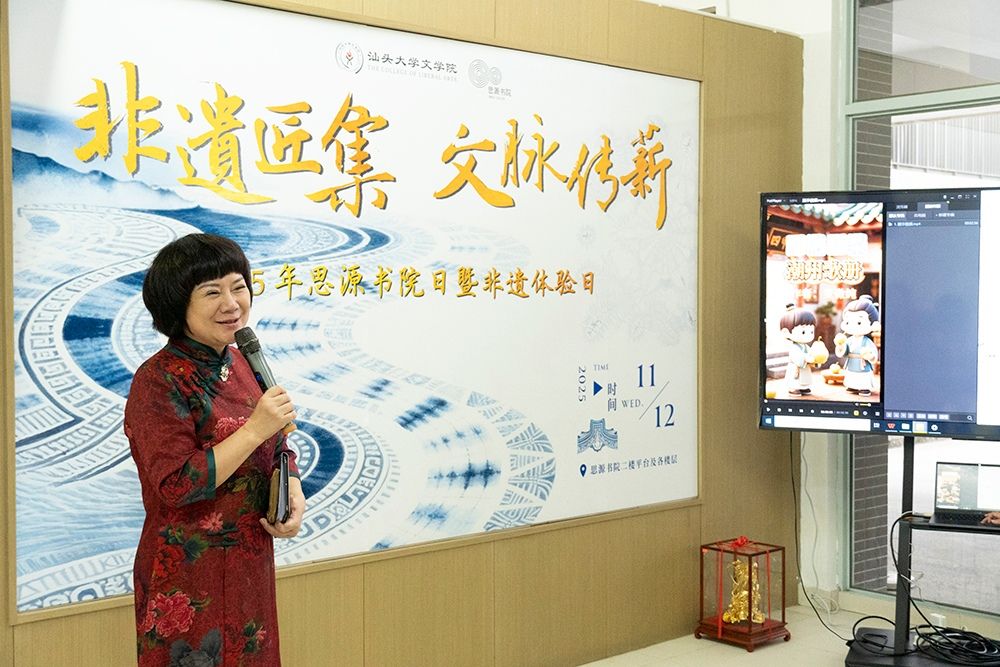 活动现场的非遗工坊集群堪称一场文化盛宴。传统技艺类非遗项目中,“指尖锦绣,潮韵流芳”潮绣体验让师生们在针线穿梭中感受刺绣的细腻;“古艺新枝,偶韵未央”铁枝木偶展示,生动演绎了传统木偶艺术的魅力;“雕琢千年,贴金流彩”潮州木雕介绍,呈现了木雕工艺的精湛绝伦。民俗文化类的“百草成园,巧手制囊”中医药香囊制作,让大家在药草香气中体会传统养生智慧;“针韵传古,线订春秋”四孔穿线装书技艺体验,带大家重温古籍装帧的匠心。数字融合类非遗项目亮点纷呈,“粿印传香,潮韵悠扬”潮汕粿印展示、“朗朗歌册,火帝巡游”潮州歌册介绍等项目,以数字技术为桥,让传统非遗焕发新活力。其中,“绘意厝角,巧辨五行”五行厝角头介绍摊位尤为吸睛,现场循环播放的科普视频极具巧思——借助AI技术将潮汕传统建筑构件“五行厝角头”打造成拟人化小精灵,以灵动可爱的形象、简约有趣的叙事风格,生动解读其蕴含的美好寓意与文化密码,收获参与者的一致点赞。其他摊位亦各展巧思,充分运用人工智能等现代科技,打破传统非遗的呈现边界,让古老文化在科技赋能下愈发鲜活可感,尽显创意无限的文化创新魅力。