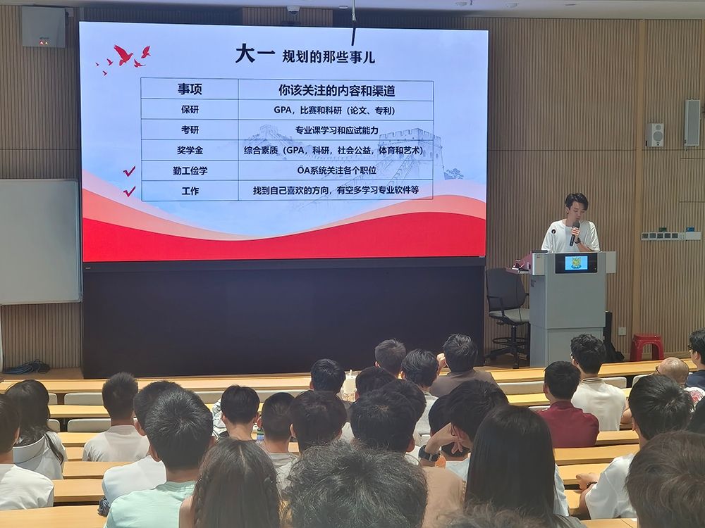 10月18日,首场活动“新生赋能,从0到1的完美突破”在东海岸校区拉开序幕。活动聚焦新生普遍关注的入党流程、学业生涯规划、科创竞赛入门、选课策略与心态调适等方面,邀请高年级优秀学子进行经验分享。已保研至深圳大学的刘德荣系统介绍了入党流程,还结合实战经验解析了选课技巧;保研至厦门大学的吴承彪分享了清晰的学业进阶路径;保研至吉林大学的宋亚涛围绕科创竞赛入门作了详细讲解;中共预备党员张泽键则引导新生实现从“悬浮”到“着陆”的心态转变,为2025级新生顺利适应大学生活提供了全方位支持。