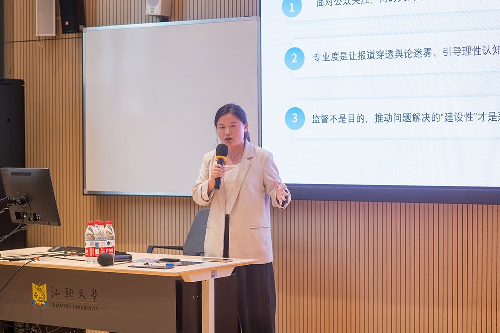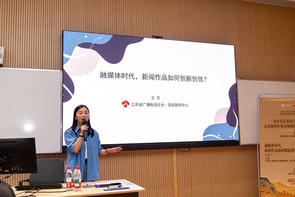 江苏省广播电视总台融媒体新闻一部主任王芳以获奖作品《从一到无穷——张纯如的力量》为案例,向学生分享融媒体时代新闻创新创优的实践路径与思考。