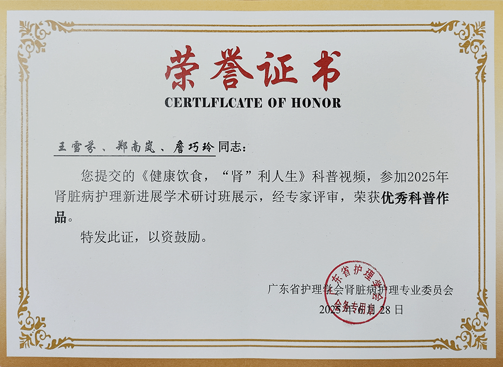 此次获奖是附二院肾内科长期深耕科普工作的成果体现。近期,肾内科护理团队王雪芬、郑南岚、詹巧玲创作的《健康饮食,“肾”利人生》科普视频,参加2025年广东省护理学会肾脏病护理专业委员会组织的肾脏病护理新进展学术研讨班展示,荣获优秀科普作品。