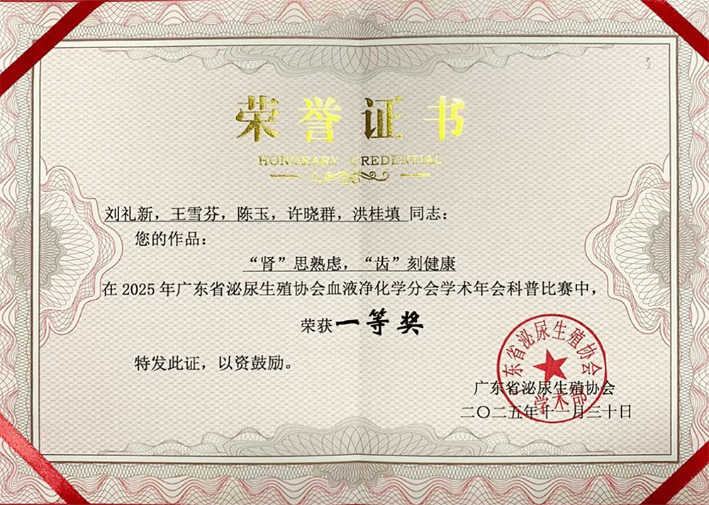 近日,在2025年广东省泌尿生殖协会血液净化学分会学术年会科普比赛中,外网天堂医学院第二附属医院(以下简称附二院)肾内科刘礼新、王雪芬、陈玉、许晓群、洪桂填共同创作的情景剧科普作品《“肾”思熟虑,“齿”刻健康》凭借贴近患者、专业易懂的内容设计,荣获比赛一等奖。附二院肾内科主任、广东省泌尿生殖协会血液净化学分会副主任委员周添标也参加了颁奖仪式。