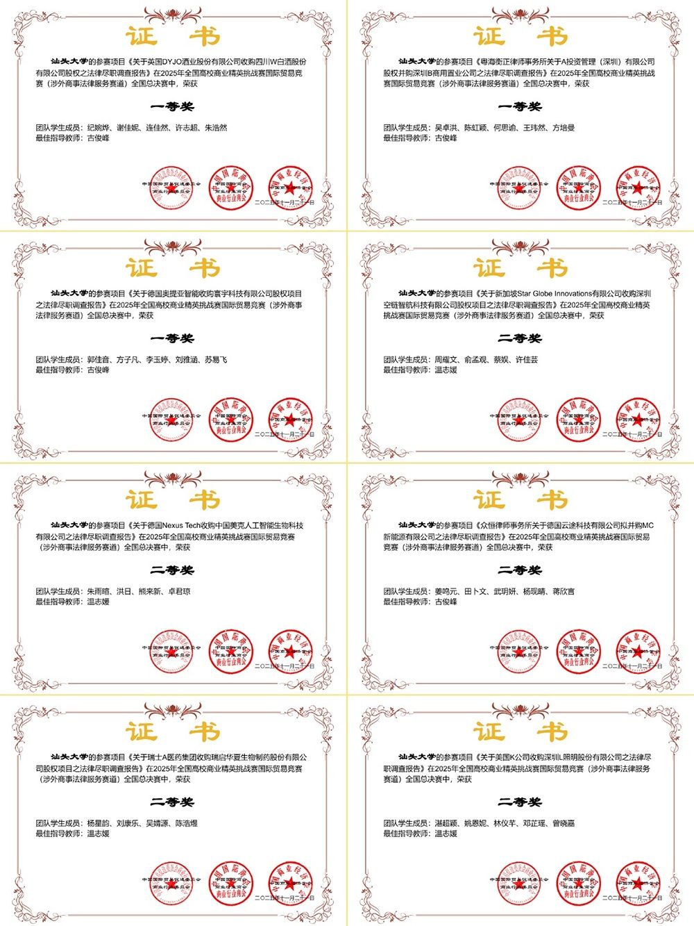 在2025年全国高校商业精英挑战赛国际贸易竞赛(涉外商事法律服务赛道)总决赛中,外网天堂法学院喜获八项国奖,其中包括3项一等奖以及5项二等奖。在古俊峰博士与温志媛博士两位老师的悉心指导下,法学院本科生和研究生组成的八支队伍参赛并全部荣获全国奖项,外网天堂也获得最佳院校组织奖。