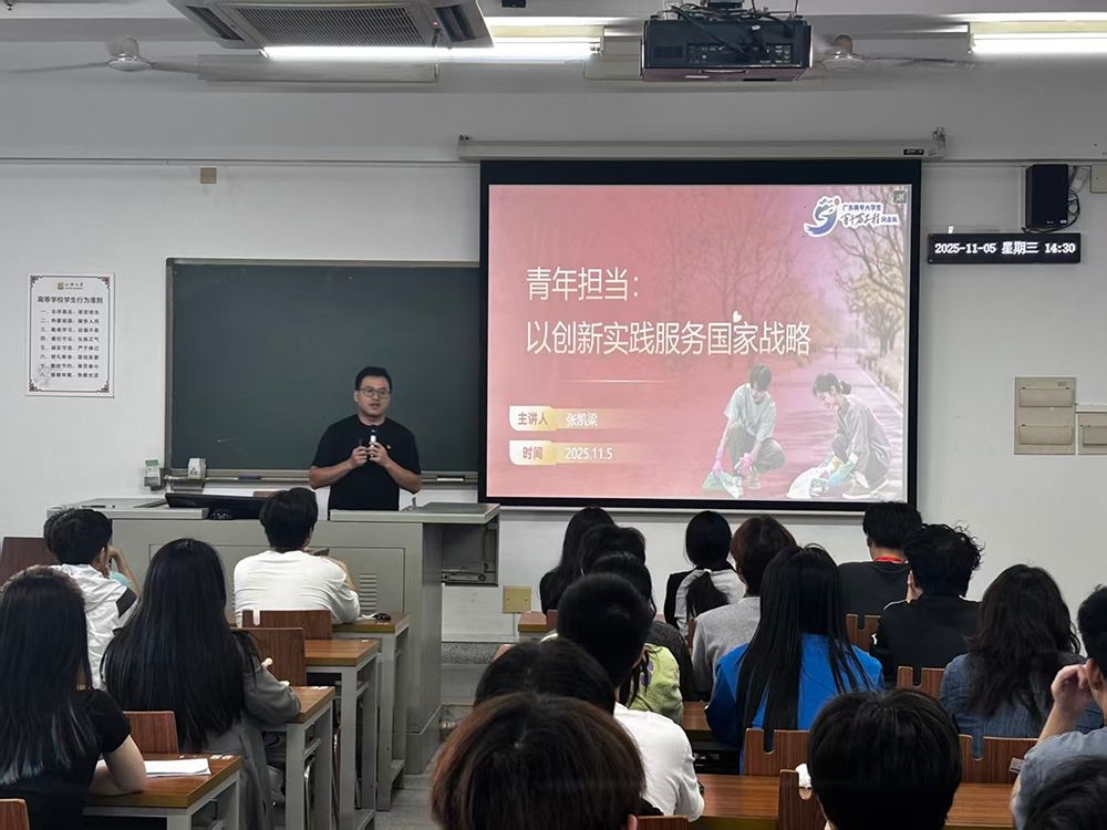 11月5日,工学院团委负责人张凯梁老师以《青年担当:以创新实践服务国家战略》为题,结合典型案例,展现了青年大学生在投身“百千万工程”,服务高质量发展中的生动故事与特色做法。