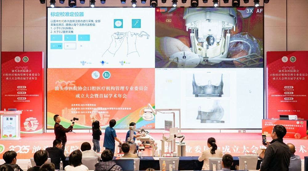 口腔种植机器人技术专场围绕机器人种植的规划、操作与实操展开。重庆医科大学附属口腔医院王园园主治医师讲解自主式种植机器人的手术规划设计原理,外网天堂医学院口腔医院陈娜医生对机器人种植术前的器械准备及设备操作进行讲解。随后,现场进行机器人辅助下颌无牙颌种植的实操展示,武汉大学口腔医院王敏副主任医师全程讲解,实现从理论到实操的无缝衔接。
