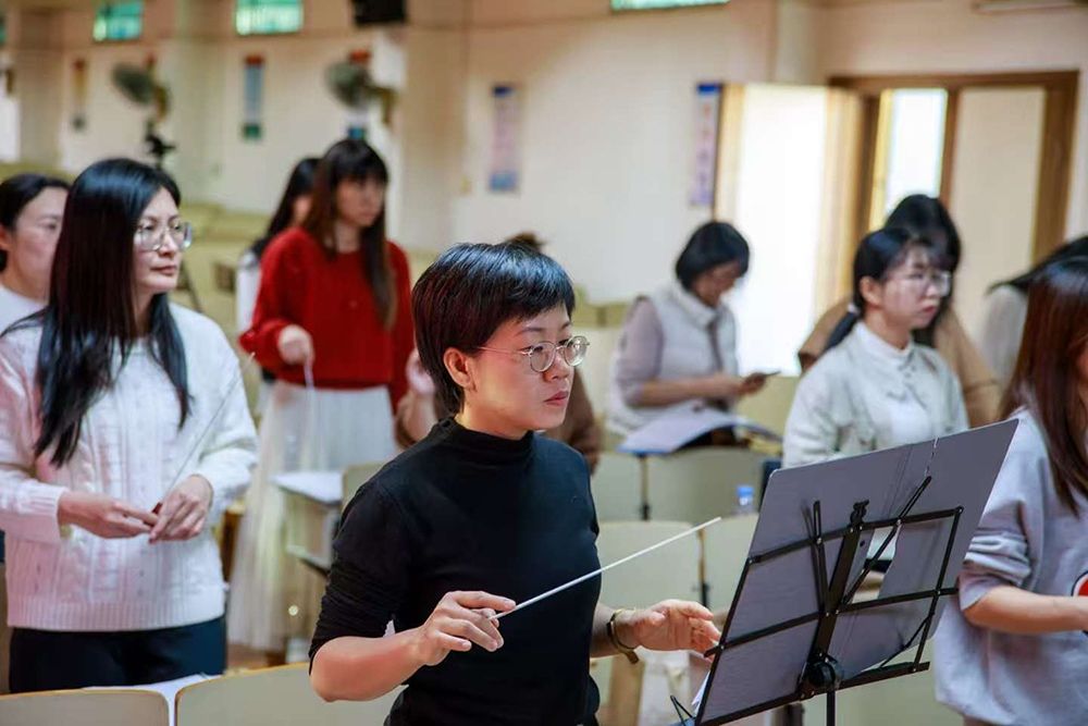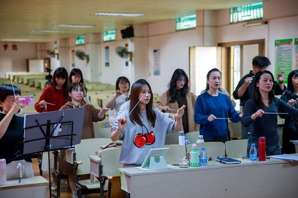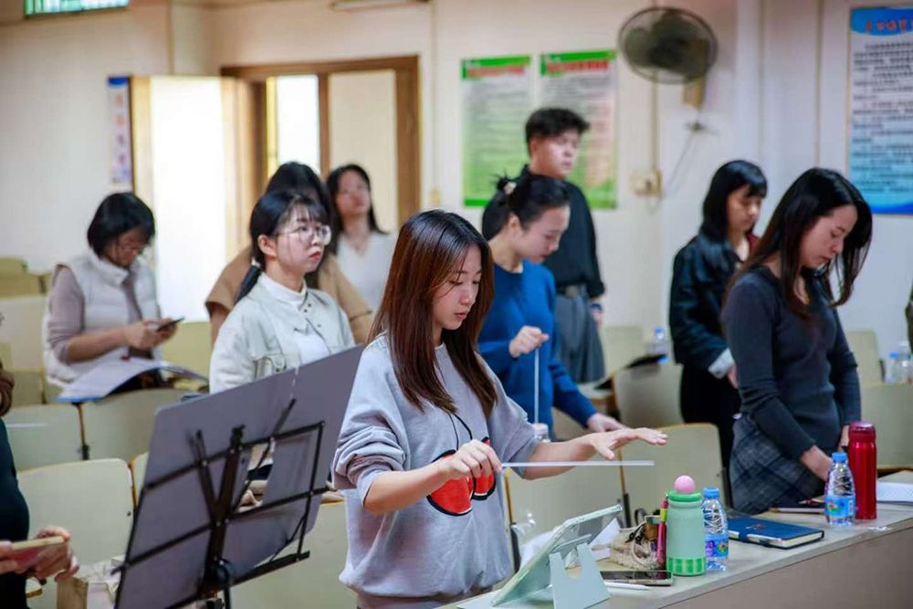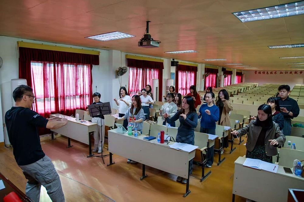 在节奏体验与教学实践环节中,教师们积极参与节奏控制的尝试,通过渐慢、拉长、分段强化等手法亲身体验音乐表现的多样性。林伟杰鼓励大家:“我们是音乐老师,首先要对音乐有感觉,先别管水平高低,但要敢尝试、敢表现。”现场气氛活跃,不少教师在互动中逐步放开,结合自身教学实际提出困惑,林伟杰一一给予回应,并引申出合唱教学与器乐配合的实际案例。在谈及合唱编排时,他建议教师们可组团演唱《春天的歌》,并适当简化声部结构,注重和声的整体协调性。他特别提醒表演者要“优于观众”,即在舞台上主动控制节奏与情绪,增强音乐的引导力与舞台表现力。