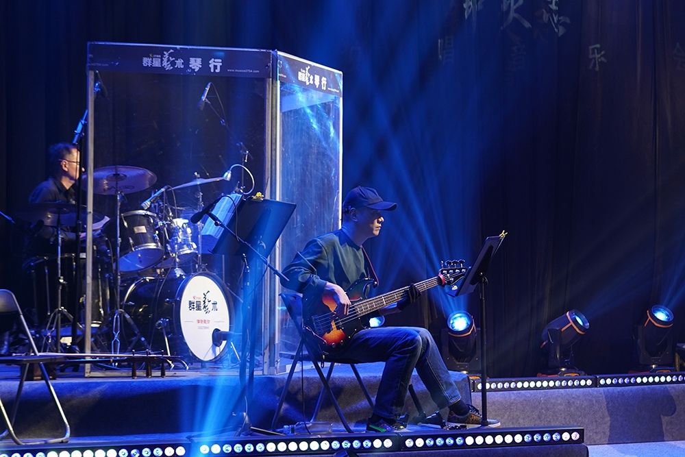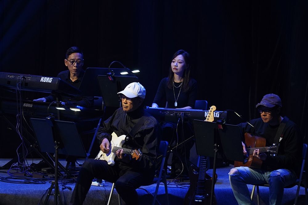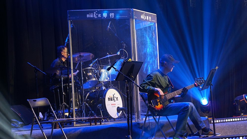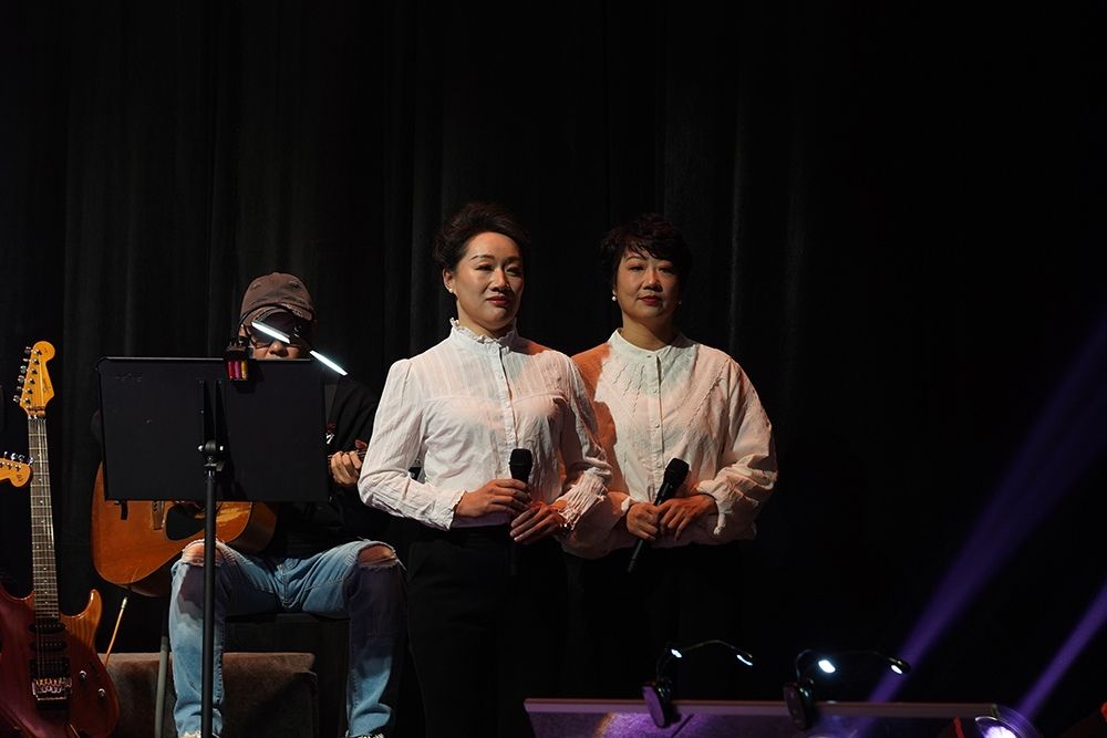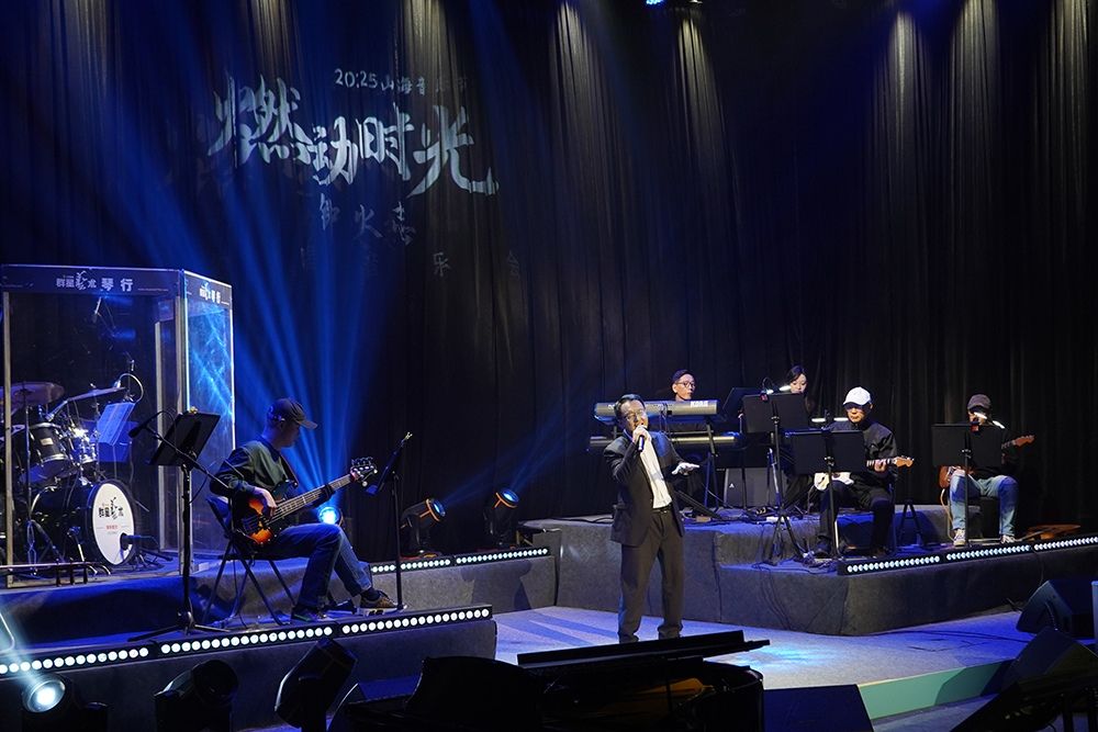 第二乐章是“仁心豪情”。《赤伶》开场,钟火志与钟子妍的戏腔与流行碰撞,郑毅蓁、陈珮琪、欧阳晓东的伴奏为这段跨界演绎注入细腻张力;《花妖》中,刘雨声老师的二胡如泣如诉,将刀郎笔下的故事拉得悠长婉转;《阿爸说》的潮语温情里,三位伴奏的和弦层层递进;《精忠报国》激昂旋律响起,全场跟着钟火志的嗓音齐声高唱,爱国豪情满溢。《大鱼》的空灵收尾中,钟子妍的歌声与丽可乐队的伴奏交织,台下手机星海随节奏轻轻摇摆,瞬间将现场拉入悠远意境。