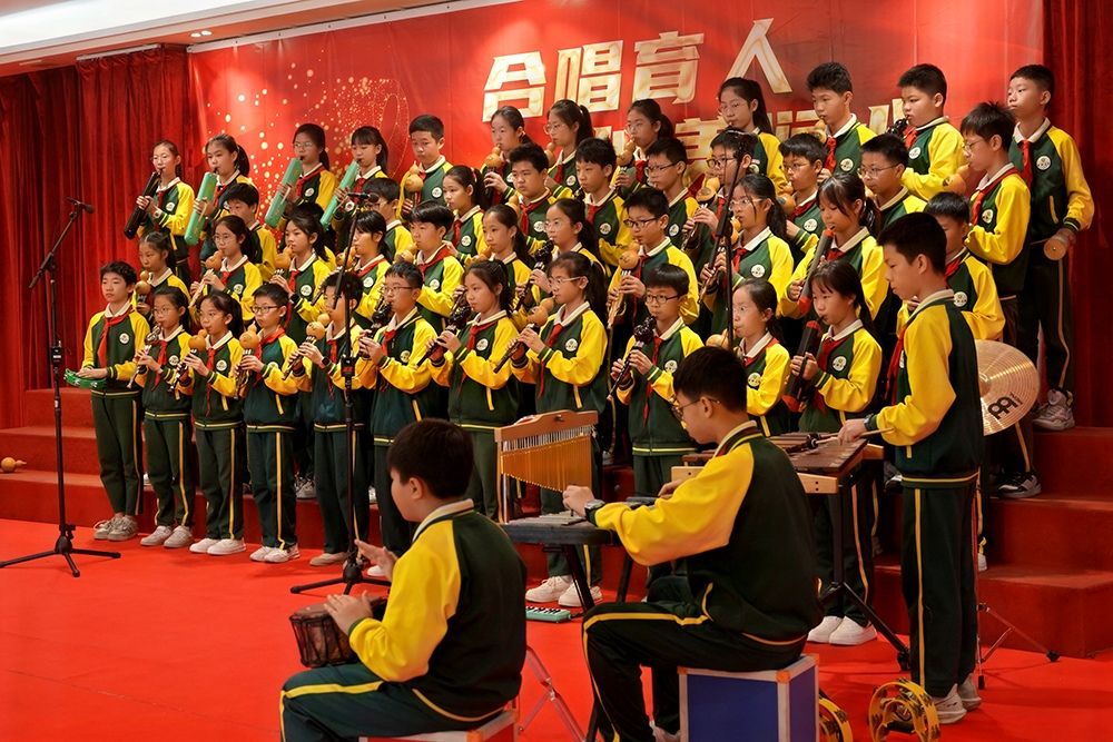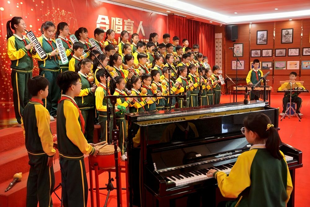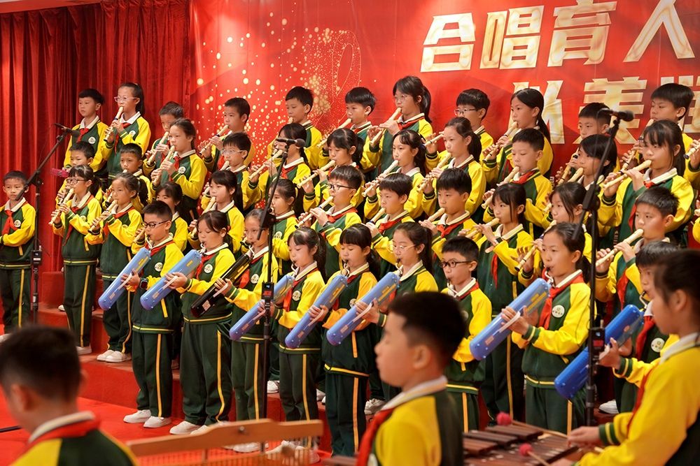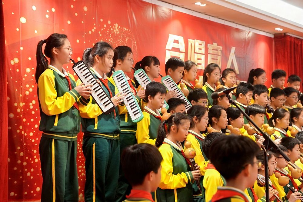 在林玫华老师的指挥下,潮阳区河溪西田小学402班的同学们用器乐为师生们带来了《狐狸舞曲》,跳动的音符描绘出了一幅欢乐的场景。
