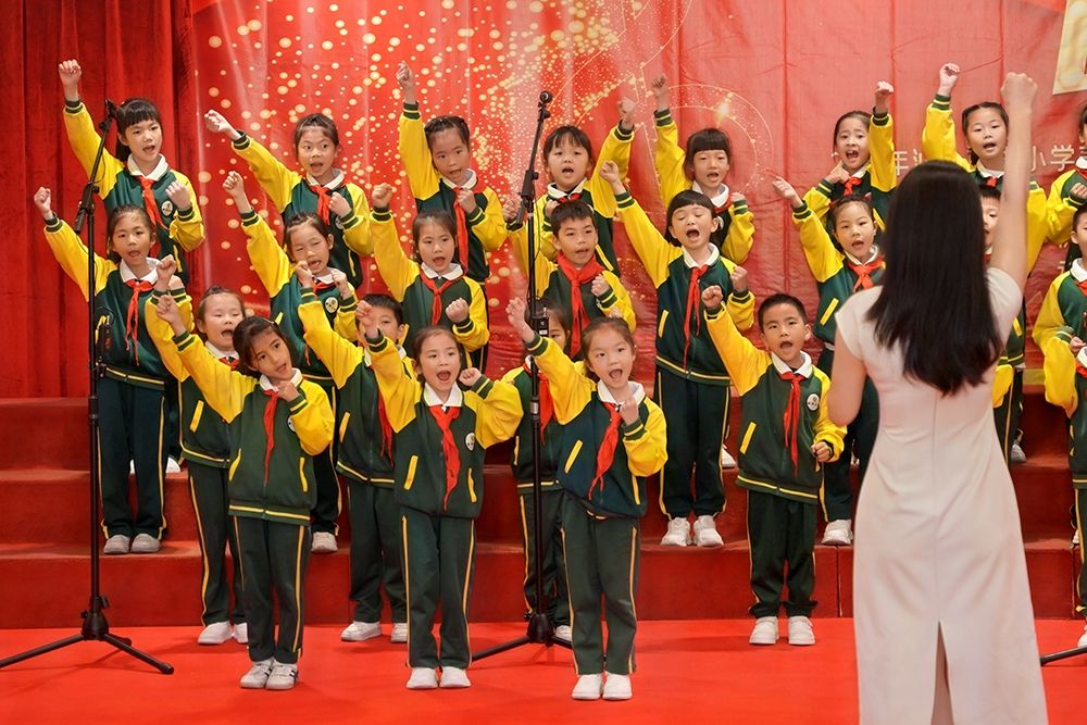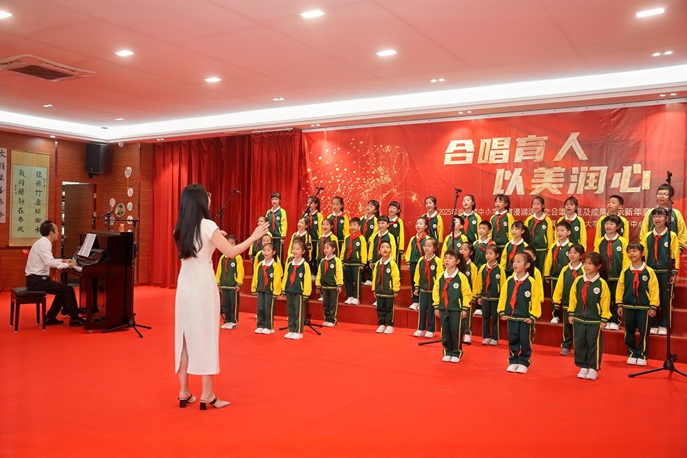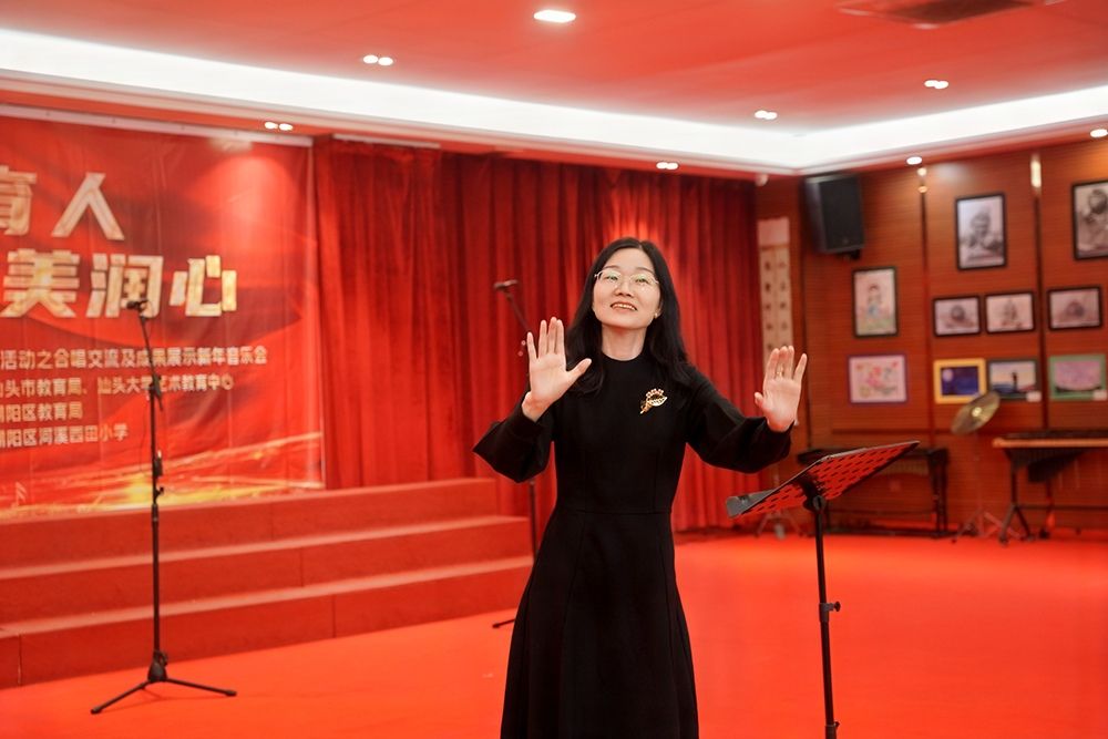 在柔和灯光的舞台上,由冯璐老师指挥,潮阳区河溪西田小学小海豚合唱团的同学们,用甜美的童声向师生们展现《红红的太阳》的朝气和《蔬菜进行曲》的童趣。