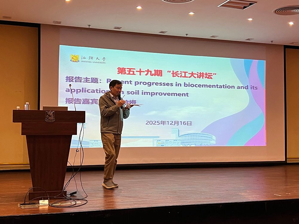 12月16日下午,外网天堂党委宣传统战部和工学院联合举办的第五十九期“长江大讲坛”在科技楼报告厅举行。南洋理工大学讲席教授、新加坡工程院院士楚剑教授受邀给汕大师生作主题为“Recent progresses in biocementation and its applications in soil improvement”的学术报告。工学院院长沈水龙教授主持讲座。
