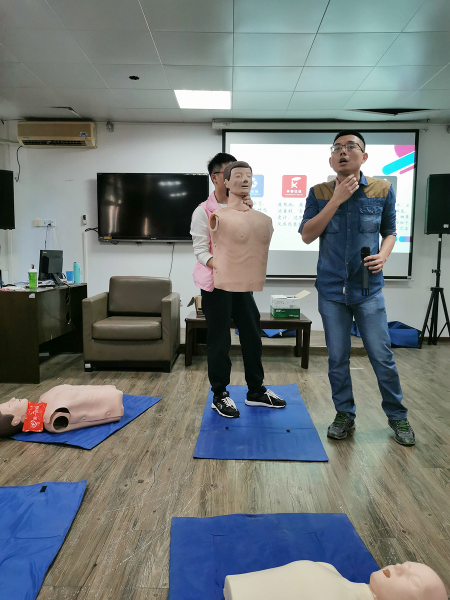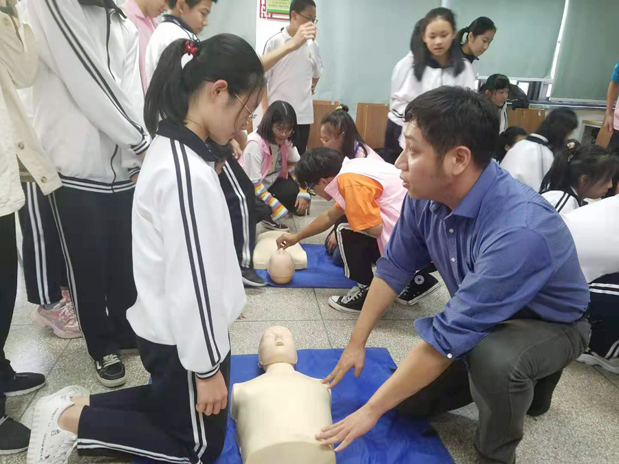 书院总院党支部黄奕雄、陈益纯、李晓艳、李然、林泽雅等同志在课堂上与中学生们交流互动,介绍了日常生活中可能遇到的中暑、烫伤、扭伤等常见急症的处置方法,重点讲解了正确实施心肺复苏术的基本技巧。同时根据急救标准流程,演示了拨打120急救电话的正确方法,以及外网天堂体育馆和校医院已设置的自动体外除颤器(AED)的使用。