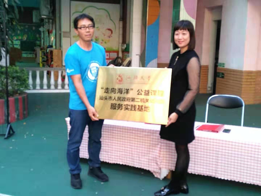 在正式授课之前,幼儿园和《走向海洋》课程组的师生举行了一个简短的授牌仪式,理学院孙泽伟老师代表《走向海洋》课程组,将《走向海洋》公益课程服务实践基地牌匾交予幼儿园陈纯园长。陈园长在致辞中对汕大师生的到来表示热烈的欢迎,并对外网天堂《走向海洋》教学服务基地的建立表示由衷的高兴,她说道:“在接下来的三年,幼儿园将积极配合汕大师生来园开展《走向海洋》宣教活动,为播种祖国护海种子尽一份力量。”幼儿园的孩子们也为课程组赠送了海洋主题的美术作品。在郑菡副园长的带领下,全体小朋友们和教师一起庄严宣誓:“从今天起,关心海洋环境与生物,面朝大海,拥抱生命,告诉他们,我们的态度:美丽的海洋,我为你祝福,愿你有一身清澈湛蓝的纱裙;愿你的孩子,不再被人类追逐。我只愿面朝大海,春暖花开!”