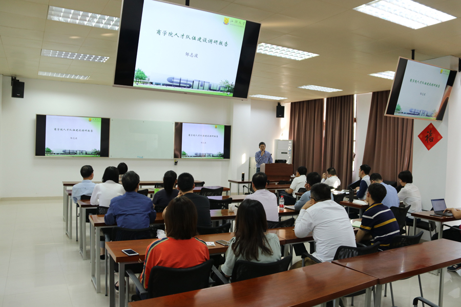 邹志波回顾了商学院人才队伍近期建设情况,分析了商学院人才队伍的现状、背景,以及当前战略转型背景下学院人才队伍存在的问题,并提出了拓展人才引进工作思路和人才保持工作思路。邹志波指出,学院人才队伍建设现阶段的目标是在总量相对控制的前提下进行人才队伍结构的优化,人才引进工作的方式方法要从相对被动向主动引进转化,将工作做在前面,做在细处,要从人才队伍待遇的公平、行政管理体系运行的效率、学术氛围的营造等方面打造待遇留人、情感留人、事业留人的人才保持体系。