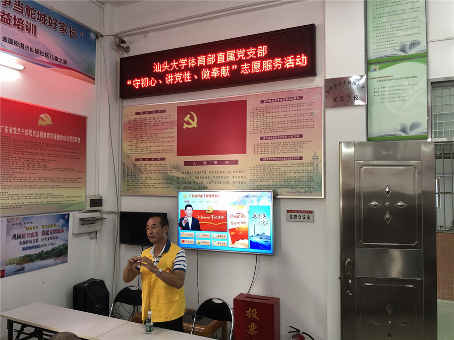 10月23日下午,体育部直属党支部和“联村共建”单位金平区水仙社区党支部合作,组织全体党员前往水仙园社区开展“守初心,讲党性,做奉献”志愿服务活动。