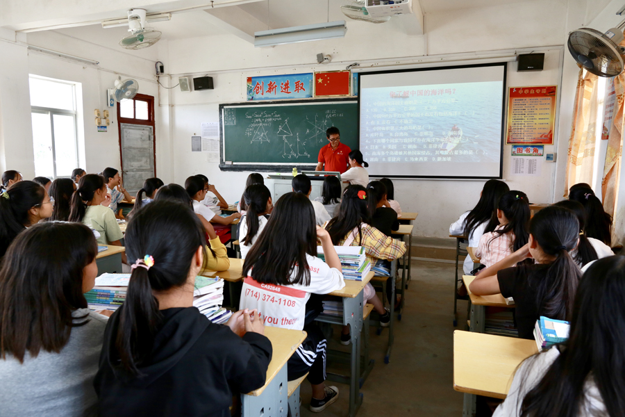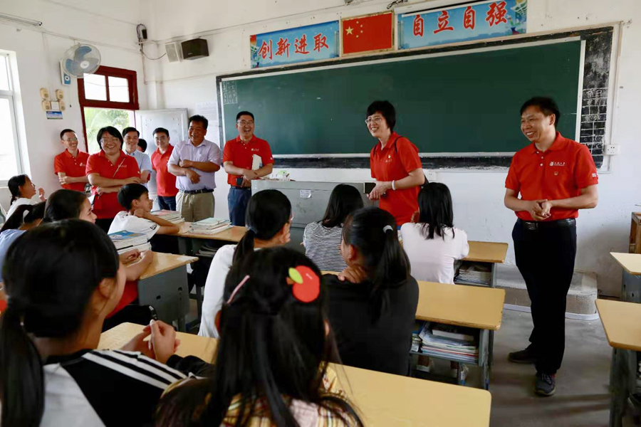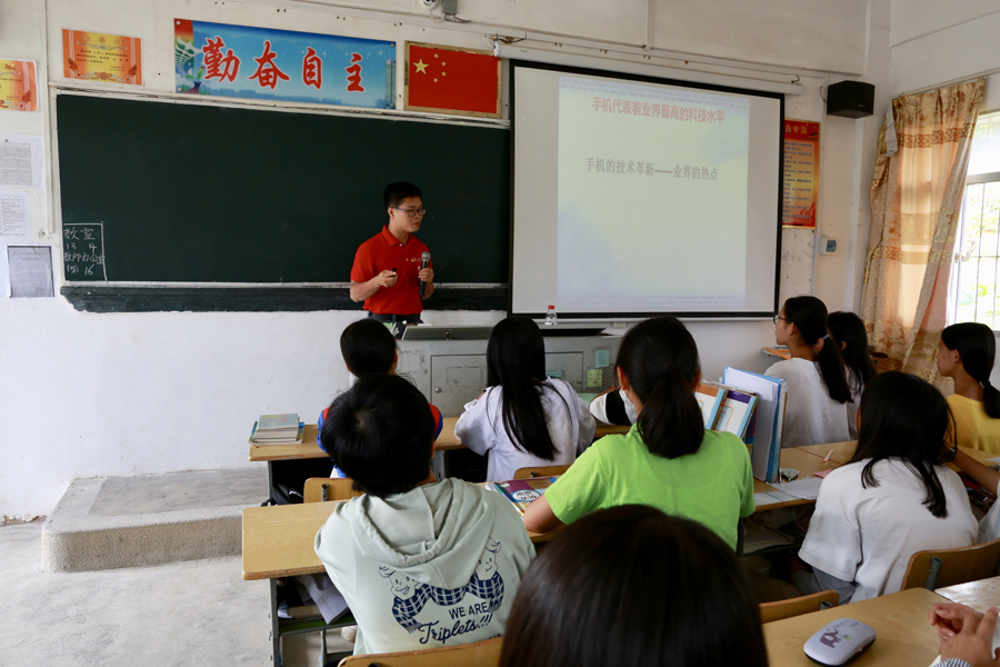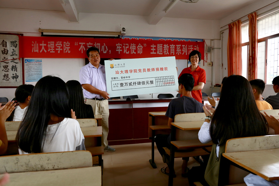 离开红场,老师们又马不停蹄地赶到雷岭中学,那里还有一百多位同学等待着呢!林锦香书记首先把凝聚理学院59位教师党员心意的12400元捐款转交给了雷岭中学的彭光远校长,随后,谢向生老师和孙泽伟老师作为代表给同学们上了两堂科普课,孙老师还自备了小礼物,很受同学们欢迎。在两位老师讲课的同时,其他老师与雷岭中学的20余位教师代表开展了面对面座谈,通过座谈,大致了解了雷岭中学的现状:作为雷岭镇唯一初级中学,雷岭中学当下的主要困境来自生源质量严重下滑,学生的基础超出想象的薄弱。手机普及、“留守儿童”是造成困境的主要原因,而近年强调的素质教育实际上加剧了教育的不平衡,使边远地区的教育水平与大城市越拉越大。“教书育人”是教育工作者的初心,无论对象。理学院的老师都迫切希望能为老区“扶智”和“扶志”做出自己的贡献,希望尽快听听同学们的心声。