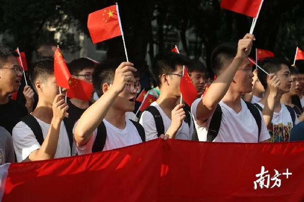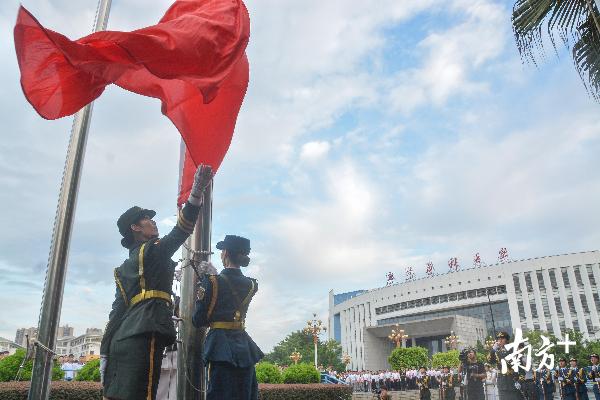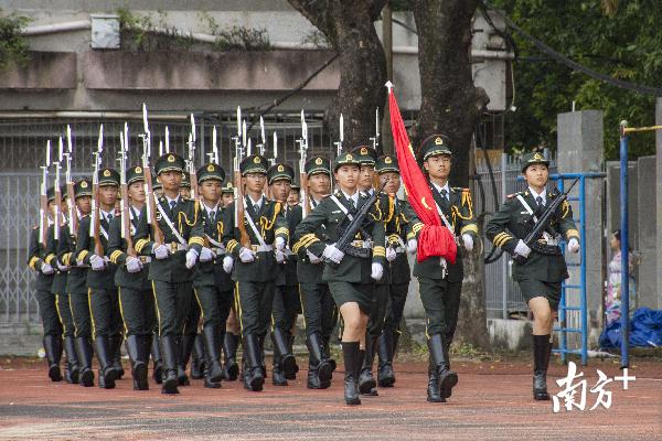 在广东医科大学东莞校区,在万名师生的注目礼下,鲜艳的五星红旗进场伴随着庄严的国歌冉冉升起、迎风飘扬。广东医科大学学生、国旗仪仗队指挥手古丽皮亚木·吾斯曼说,国旗仪仗队的训练让她体会到爱国从来都不是空洞的口号,而是具体的行动。每一个口令、每一个正步、每一次挥动,都是对自我的突破,都饱含对祖国的热爱。