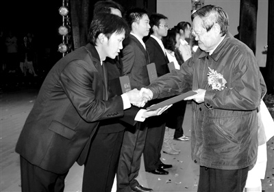 2008年,杨振宁为首届杨振宁奖学金获奖者颁奖。来源:东莞理工学院公众号