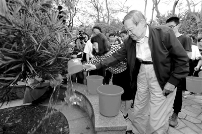 2017年,杨振宁伉俪为2008年亲手种植的罗汉松浇水。