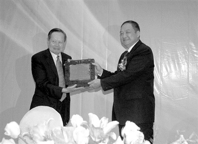 2007年,中山大学校长黄达人向基金会董事会名誉主席杨振宁赠送纪念品。