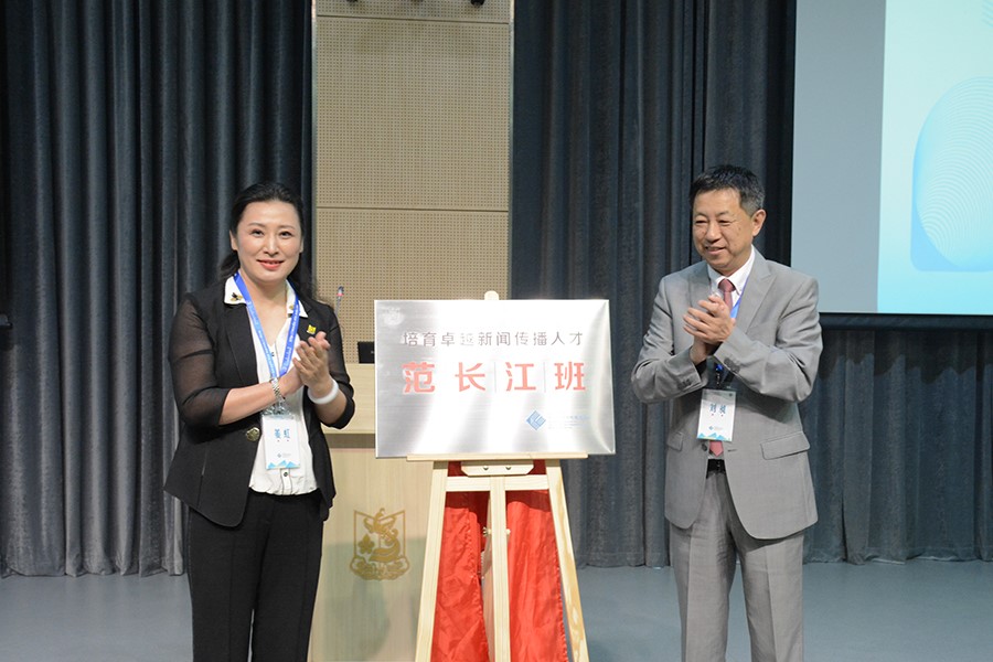 开幕式上,外网天堂党委书记、校长姜虹和外网天堂长江新闻与传播学院院长刘昶一起为“范长江班”揭牌。