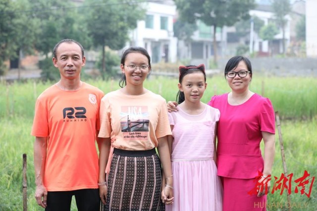 (卢悦一家:左起父亲卢庆丰、卢悦、妹妹卢珺、母亲何艳姣。 新湖南客户端记者 周林熙 摄)