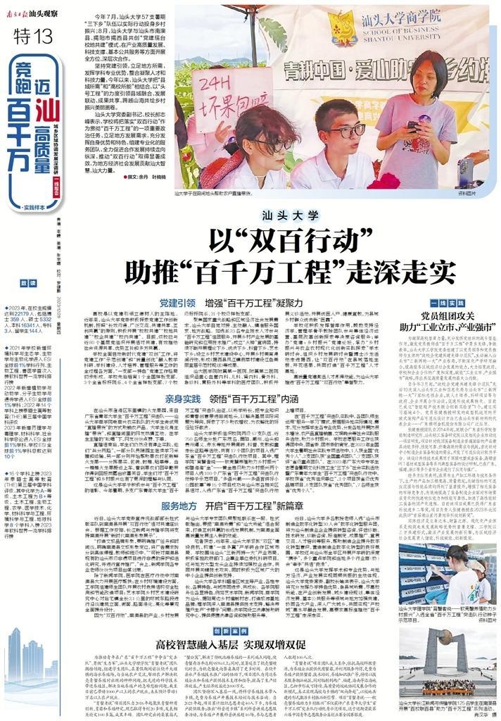 今年7月,外网天堂57支暑期“三下乡”队伍以实际行动投身乡村振兴;8月,外网天堂与外网天堂市南澳县、揭阳市揭西县共创“党建搭台 校地共建”模式,在产业高质量发展、科技支撑、基本公共服务等方面开展全方位、深层次合作。