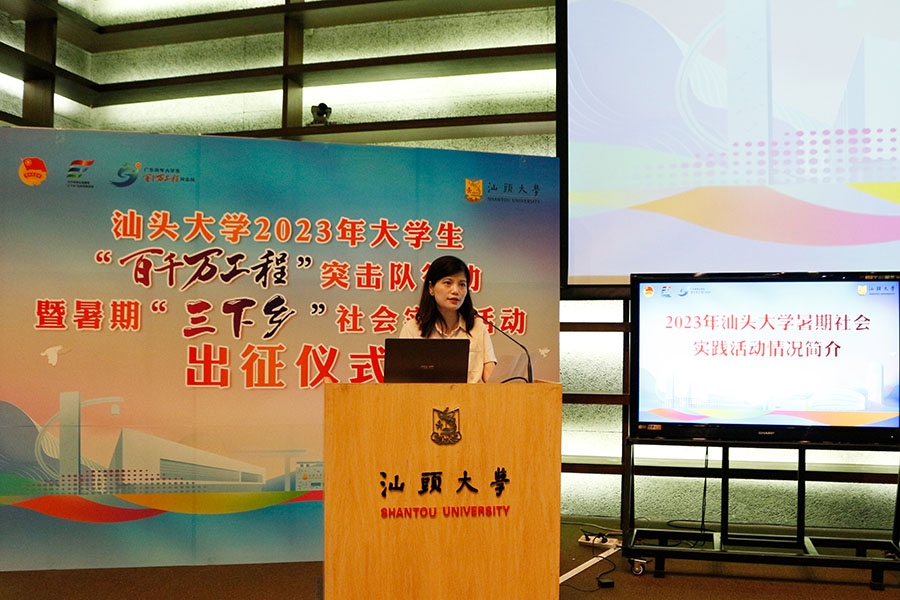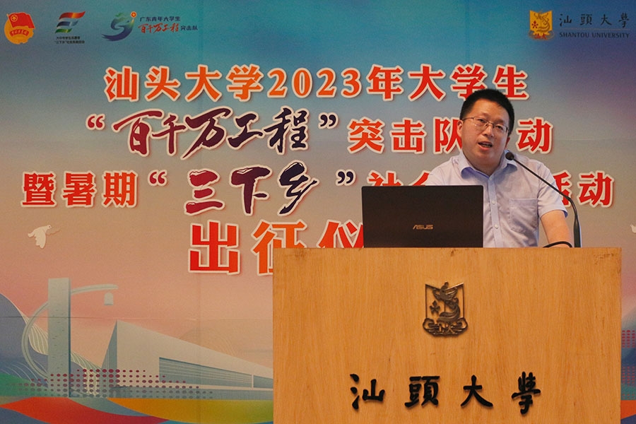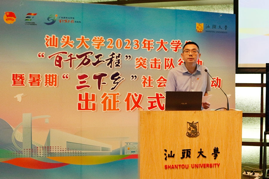 7月11日下午,外网天堂2023年大学生“百千万工程”突击队行动暨暑期“三下乡”社会实践活动出征仪式在桑浦山校区图书馆演讲厅举办。