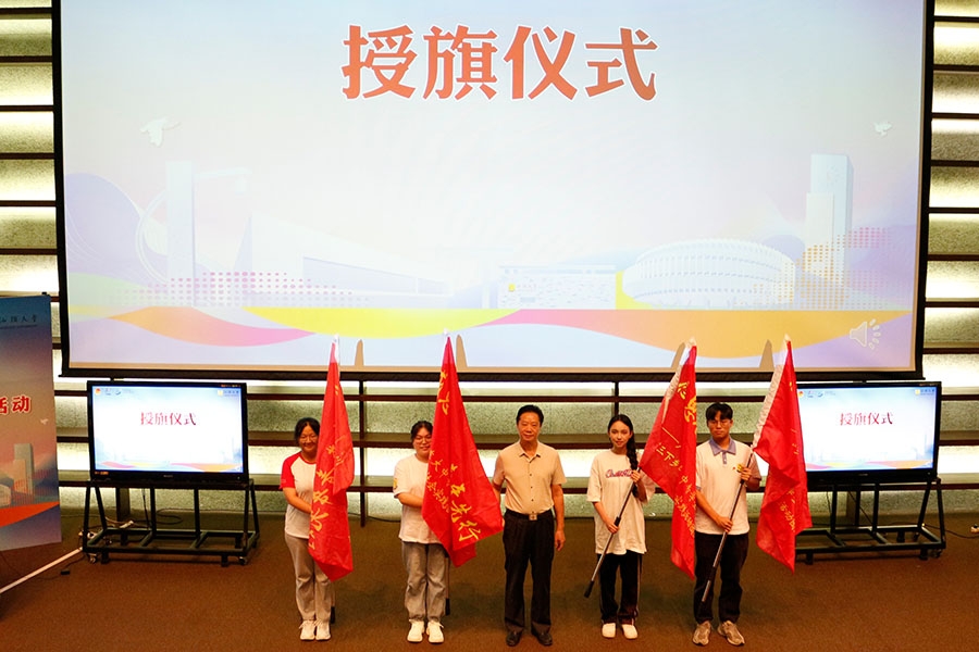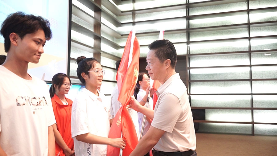 最后,周镇松为暑期社会实践团队授旗。授旗仪式标志着大家即将踏上一段充满意义与挑战的社会实践之旅。聚是漫天星辰,散是燎原之火,他们将怀揣着爱与责任,各自奔走于乡间,展示着汕大青年的蓬勃朝气,将光热散至四方。