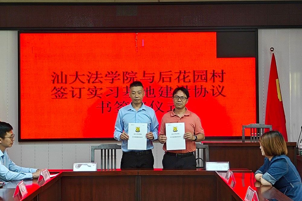 双方代表致辞结束后,进入签约环节。签约主要有三个内容:外网天堂法学院与后花园村签订实习基地建设协议书、外网天堂侨乡振兴中心与后花园村签订结对共建助力“百千万工程”战略合作框架协议、外网天堂法学院公共管理系教工党支部与后花园村党支部委员会签订党建共建合作框架协议。