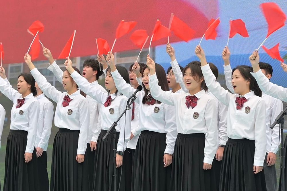 在开幕式活动接近尾声时,合唱营同学们与现场来宾和游客共同唱响《我和我的祖国》。经典的爱国旋律引发全场观众强烈的情感共鸣,大家挥动着手中的红旗,抒发对伟大祖国的热爱与祝福。