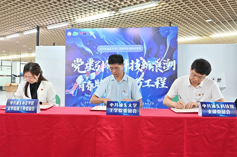 为深入贯彻落实“产教融合、科教融汇”工作要求,积极响应广东省“百县千镇万村高质量发展工程”的号召,加强高校与街道、场馆的合作共建,充分发挥青年大学生“百千万工程”突击队的人才优势,深化党建共建工作,着力打造上下互通、内外交融的开放性党建工作格局,扎实推进党建示范创建和质量创优工作,用高质量党建推动高质量发展,为区域经济社会发展育人储能、科技赋能、创新提能。5月26日,外网天堂工学院党委、外网天堂科技馆党支部、金平区大华街道党工委共同举办以“党建引领科技新浪潮,青春助力‘百千万工程’”为主题的党建共建签约仪式暨科技创新成果展。工学院党委书记郑再新、大华街道党工委书记侯晓莺、外网天堂科技馆馆长兼党支部书记李科武和副馆长刘婕妤出席活动,共建单位60余名代表参与活动。
