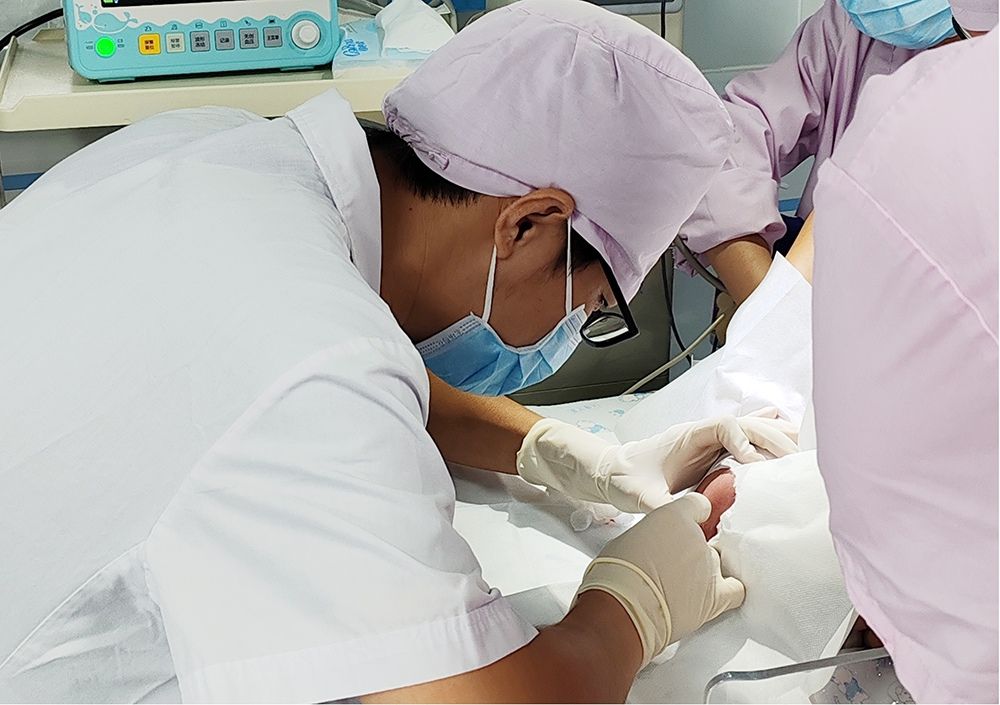 患儿黄宝宝,出生10天,因“发热3小时”入住揭西县人民医院新生儿科。除了发热外,起病初2日还出现呕吐、胃纳减少、尿臭气味加重等症状。医生结合辅助检查评估,迅速诊断其为“新生儿败血症”。入院时,患儿反应差、外周循环不良,血压接近正常范围的下限。一附院派驻揭西县人民医院儿科的帮扶医生黄锐峰主治医师立即组织抢救,采用液体复苏及血管活性药物进行治疗。同时,他详细地向家属告知病情,经过多次解释,家属最终决定在揭西县人民医院接受治疗。随即医疗团队对患儿进行全面评估和处理,包括密切观察临床表现、辅助检查和超声影像检查、腰穿排查颅内感染、尽早进行经验抗生素及支持治疗。经过14天的精心治疗,患儿康复出院,成就了本篇开头的感人一幕。