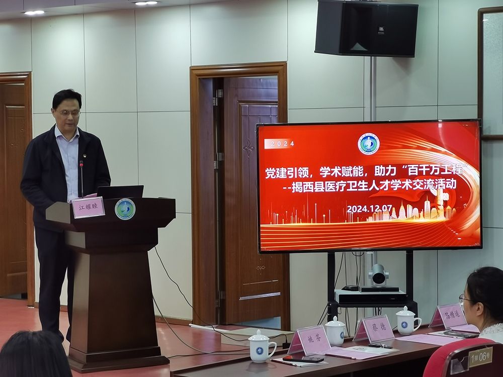 江耀睦在致辞中强调,一附院与揭西县人民医院医疗帮扶是“双百行动”的一项重要举措,一附院采取“组团式”帮扶的新模式,聚焦“服务、技术、人才、管理”4个维度,先后开展多项新技术,帮扶揭西县人民医院整体医疗水平提升。他希望通过本次“党建引领”的学术活动,进一步赋能提升地区的急危重症的诊疗技术水平,为揭西县域医疗服务能力提升贡献“附一力量”,让揭西的民众获益。